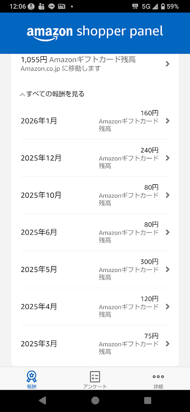 見てください、2025年5月の記録を。 この月はアンケートが多かったのですが、「5件回答して300円」もらえています。