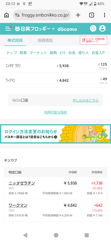 日興フロッギーでコツコツ買っていた「新田ゼラチン(4977)」。 平均取得単価1,000円ピッタリで持っていたのですが、気づけば1,414円。