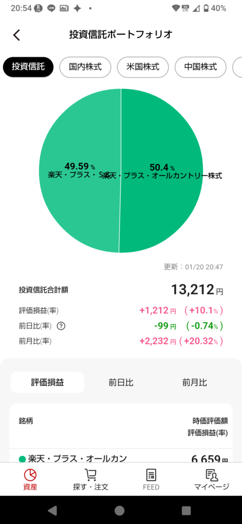 まずは、楽天ポイントと現金を併用して、積み立てている投資信託の成績です。