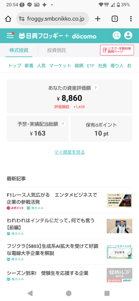 今回は、私が実際に運用している「楽天証券(投資信託)」と「日興フロッギー(dポイント株)」の、
